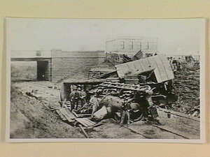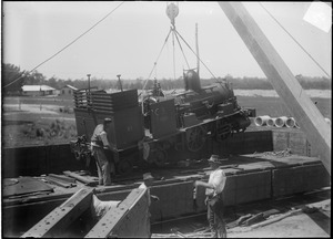 Yallourn East Camp, sliding - opp brown coal mine. Len Savige on left. Steam loco [locomotive] being unloaded. Oct 1921