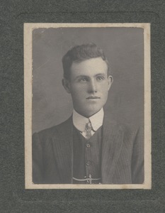 [Studio portrait of young man, three-quarter length, standing, left arm resting on studio prop]