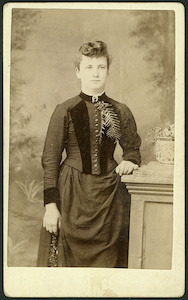 [Studio portrait of woman, three-quarter length, slightly to left, standing, left forearm resting on studio prop]