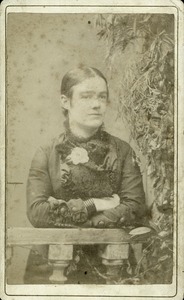 [Studio portrait of young woman, half-length, to left, arms resting on studio balustrade, flower at her neck]