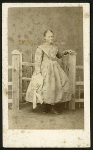 [Studio portrait of girl, whole-length, to left, standing, left hand resting on fence studio prop]