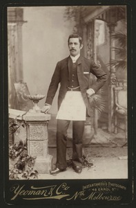 [Studio portrait of young man, whole-length, to right, standing, wearing suit with apron, right hand on studio prop, left hand on hip]
