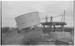 Workers fitting tank onto stand
