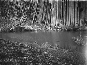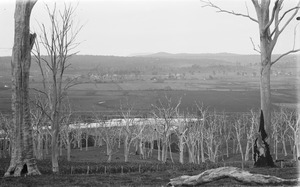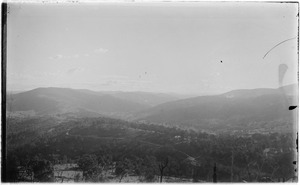Scene [looking down a slope towards a river and mountains in the distance]