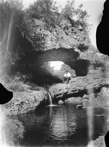 Man sitting on rocks in a river at "The Caves" [property at Hamilton owned by Wilf's father]