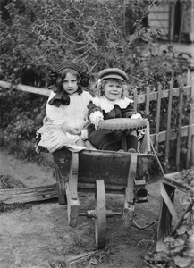 Two young girls, whole-length, full face, playing with wheel-barrow in garden