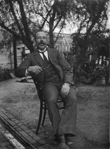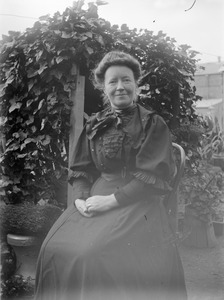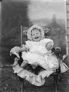 [Baby girl sitting in a chair, whole-length, full face, wearing bonnet and dress, in garden]