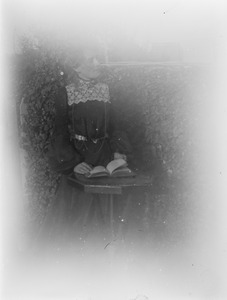 [Woman standing at a table with an open book]