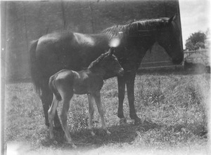 [Mare and foal in a paddock beside a barn]