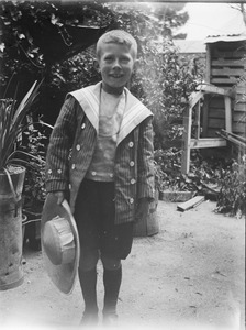 [Boy standing, holding a hat]