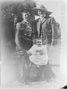 [Full-length portrait of two men in suits, superimposed on an image of a woman seated holding a child]