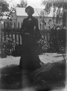 [Woman standing near a picket fence]
