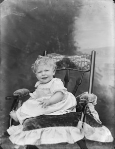 [Baby girl sitting in chair, whole-length, full face, in garden]
