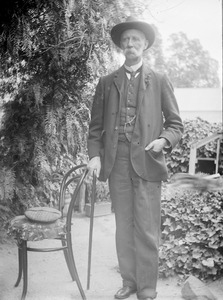 [Man standing in a garden, wearing a suit and holding a walking stick]