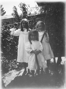 [Three small girls standing, one holding a tennis racquet]