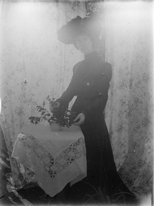 [Woman standing beside a small table]