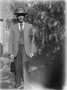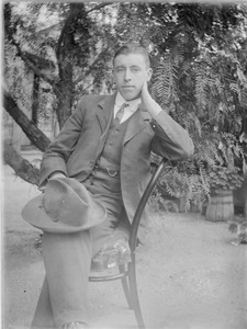 [Man standing near a pepper tree, holding his hat]