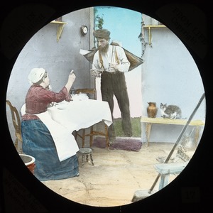 [Woman seated at table as man comes through cottage door]