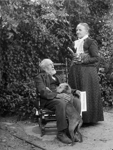 [Man in rocking chair, lady standing beside him, both whole-length, man to left, lady to right, dog jumping on man's lap]