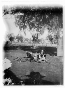 [Two dogs near a tree, one black, one black and white]