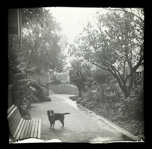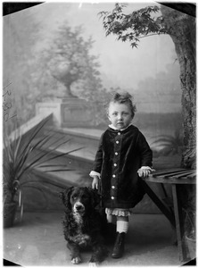 [Studio portrait of child, standing, full face, whole-length, dog at feet]