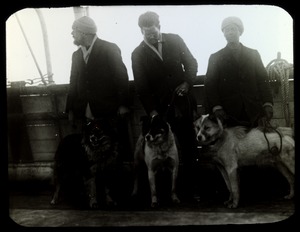 [Three men on deck of ship, each holding a dog by the leash]