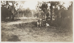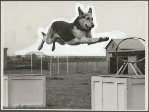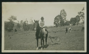 [Man on horseback with dog, in paddock]