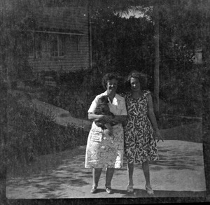Two women, whole-length, standing in front of weatherboard building, woman on left holding a dog, Mount Buffalo, Vic.
