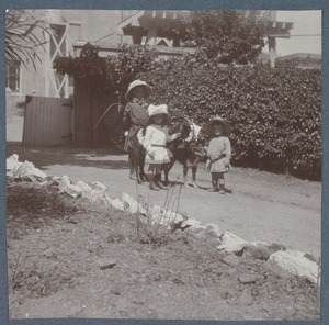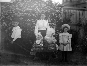 Anderson family in garden at Mynda, two youngest girls sitting in what is possibly a dog or goat cart