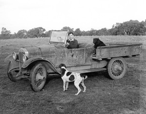 [Brownie Pearce and dogs with farm ute, Bongaroo, Corowa]