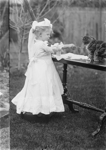 Little girl dressed up as a bride and pushing toy pram away from camera/Little girl dressed as a nurse feeding a cat from a spoon