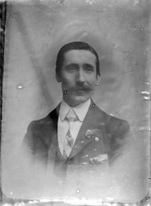 [Studio portrait of young man, head and shoulders, with moustache, slightly to right]