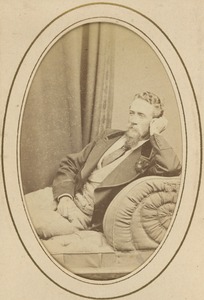 Studio portrait of an unidentified man, three-quarter length, with beard and moustache, on chaise-lounge /