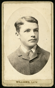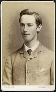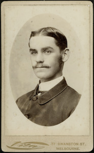 [Man, bust, to right, has moustache and short hair with centre part, Melbourne]