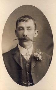 [Bust portrait of man, full face, with waxed moustache and flowers on left lapel]