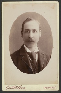 [Unidentified head and shoulders portrait of man, to left, with moustache]