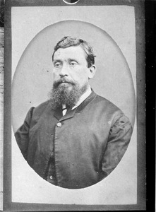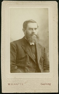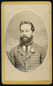 [Studio portrait of man, head and shoulders, to right, with full beard and moustache]
