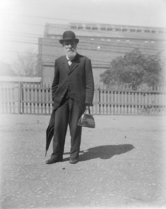 [Unidentified man, whole length, with beard and moustache, wearing suit and bowler hat, carrying umbrella and small Gladstone bag]