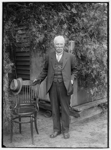 Unidentified man, whole-length, with white hair and moustache, wearing a suit, in a garden