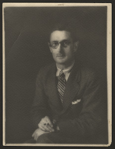 [Studio portrait of man, three-quarter length, full face, with moustache, standing, left arm resting on studio prop]