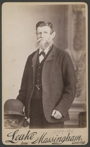 [Studio portrait of man, to right, whole-length, standing, with full beard and moustache, left hand in pocket, right hand on studio prop]