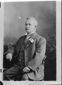 [Man seated, sporting a moustache, a fob chain, and a flower]