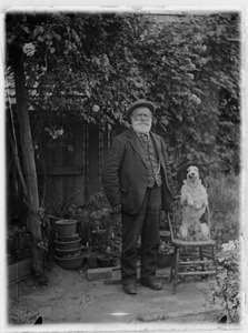[Whole-length portrait of elderly man with white beard and moustache, standing in garden, dog on a chair beside him, in begging position and wearing a hat]