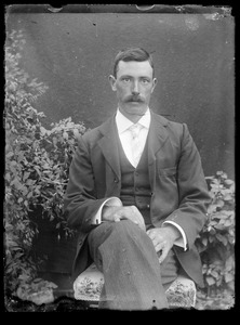 [Young man, three-quarter length, sitting with legs crossed, full face, moustache, wearing suit with vest]