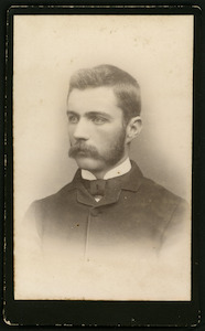 [Studio portrait of young man, head and shoulders, to left, with moustache and sideburns]