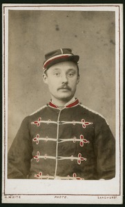 [Studio portrait of man, half-length, almost full face, with moustache, wearing miitary-styled uniform with cap]