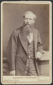 [Portrait of man, half-length, to right, standing, left arm resting on pedestal, full beard and moustache]
