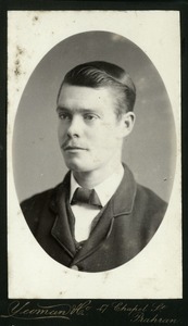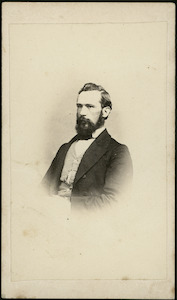 [Studio portrait of young man, head and shoulders, to left, with beard and moustache]