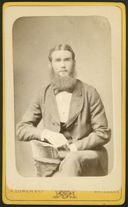 [Studio portrait of young man, three-quarter length, full face, with full beard and moustache, sitting with legs crossed]