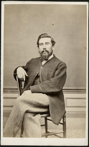 [Studio portrait of man, three-quarter length, almost full face, with beard and moustache, seated on wooden chair, legs crossed]